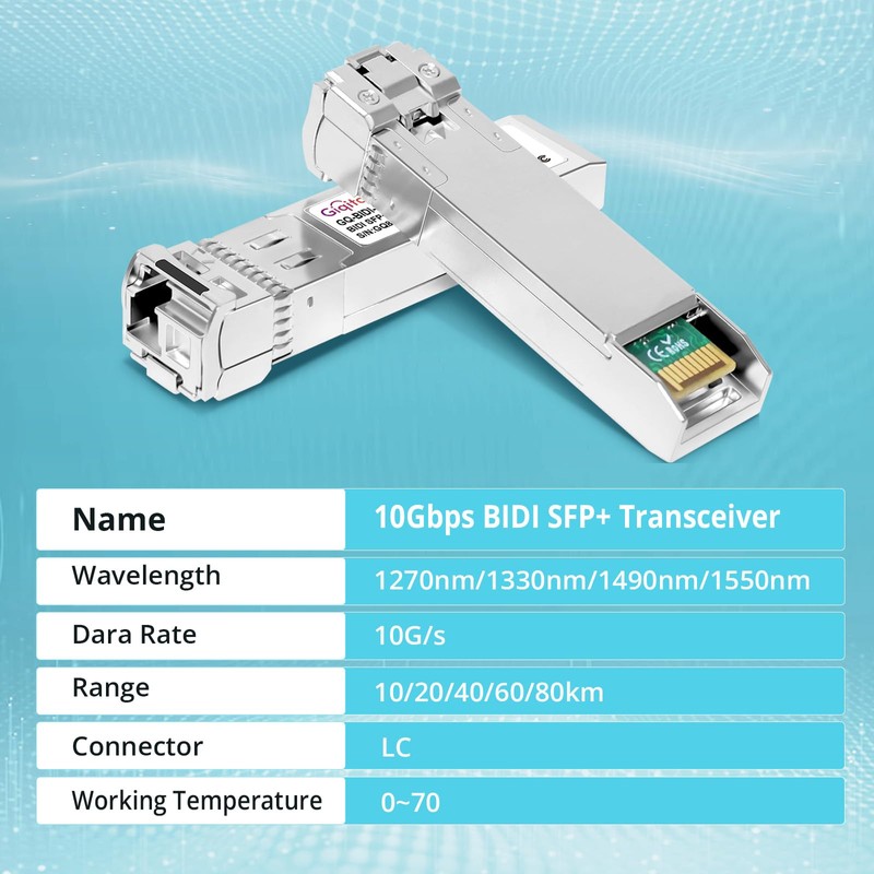 • 10GBase-BIDI Transceiver Application: Applied in Region Networks, used in fiber, switches, routers, NIC,server or other fiber optic equipments with 10G SFP+ ports.