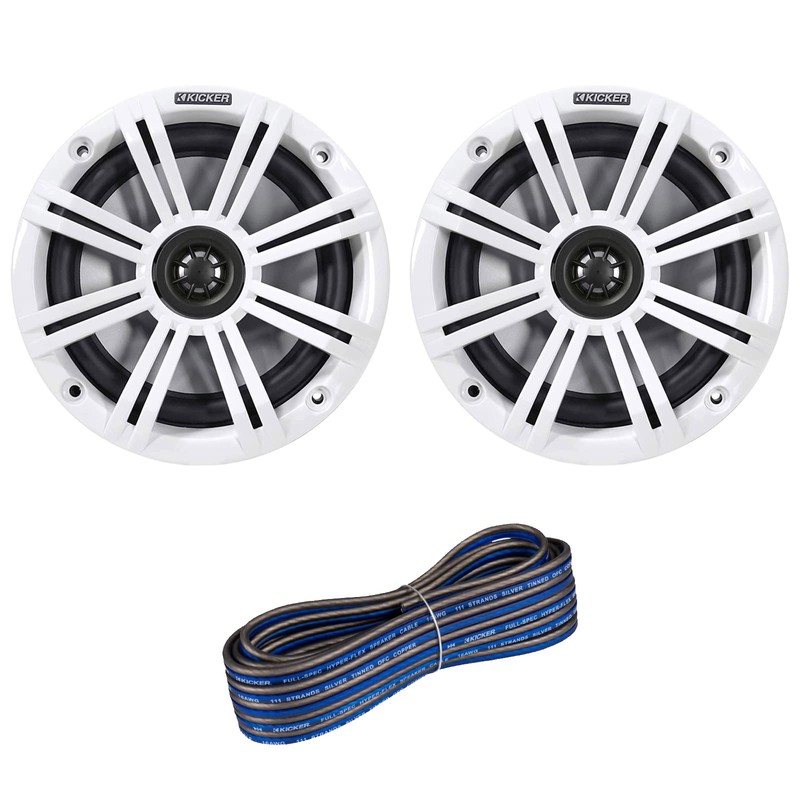 - PACKAGE BUNDLE INCLUDES: 2x Kicker 6.5" 2-Way 195W Peak Power Marine Coaxial Speaker (Bulk Packaging), 2x 6.5" White Grille for Kicker Speaker, 50-Feet 16-Gauge Speaker Wire.
