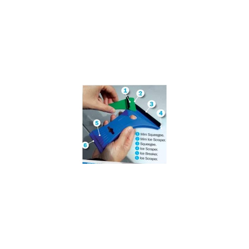 6 in 1 Ice scraper and squeegee. Includes pop-out mini scraper ideal for door mirrors and vehicle lights.