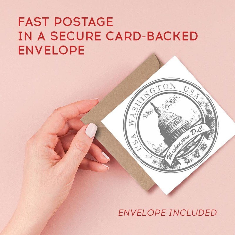 Fast postage in a secure card-backed envelope which fits through a standard letter box.