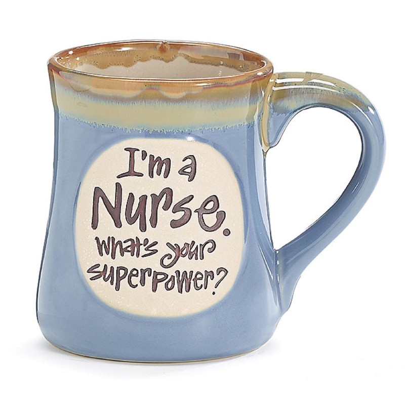 Dishwasher safe/Microwave safe. Hand-painted porcelain "I'm a Nurse what's your superpower?" mug. Individually gift boxed. 4 1/2"H X 3"Opening; 18"oz