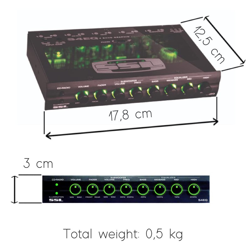 - Harmonic Distortion Factor: 0.05% S/N Ratio: 105dB Frequency Response 20-20000Hz EQ Dimensions: 17.8 x 12.5 x 3 cm Package Dimensions 22.5 x 19 x 5 cm Equalizer Weight: 0.5kg Package Weight: 0.65kg Single 1.