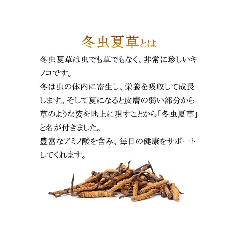 - 冬虫夏草は非常に珍しいキノコの一種です。必須アミノ酸をはじめとする豊富なアミノ酸が、毎日の健康をサポートに。