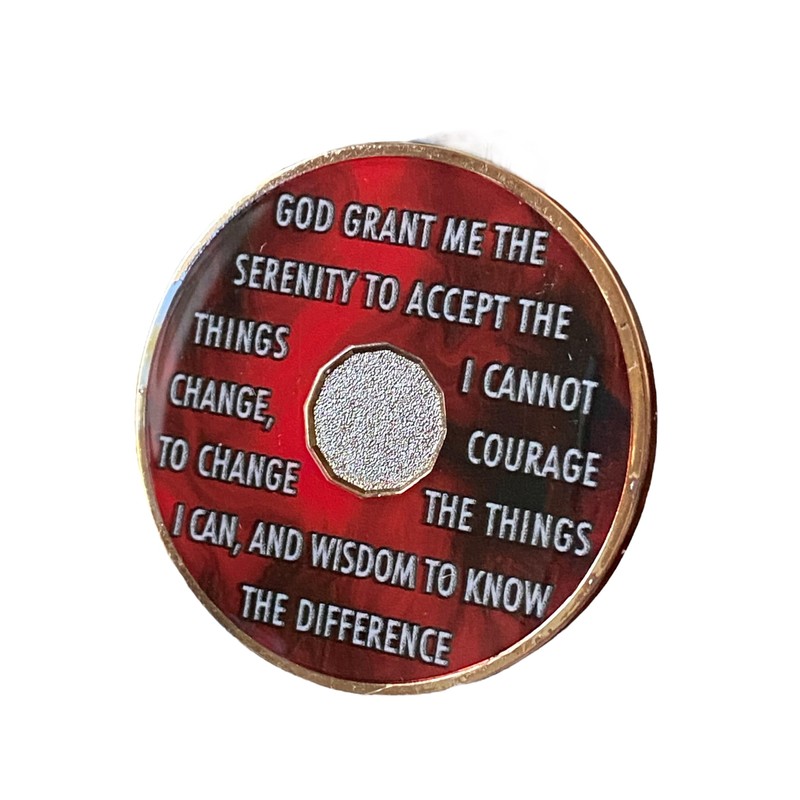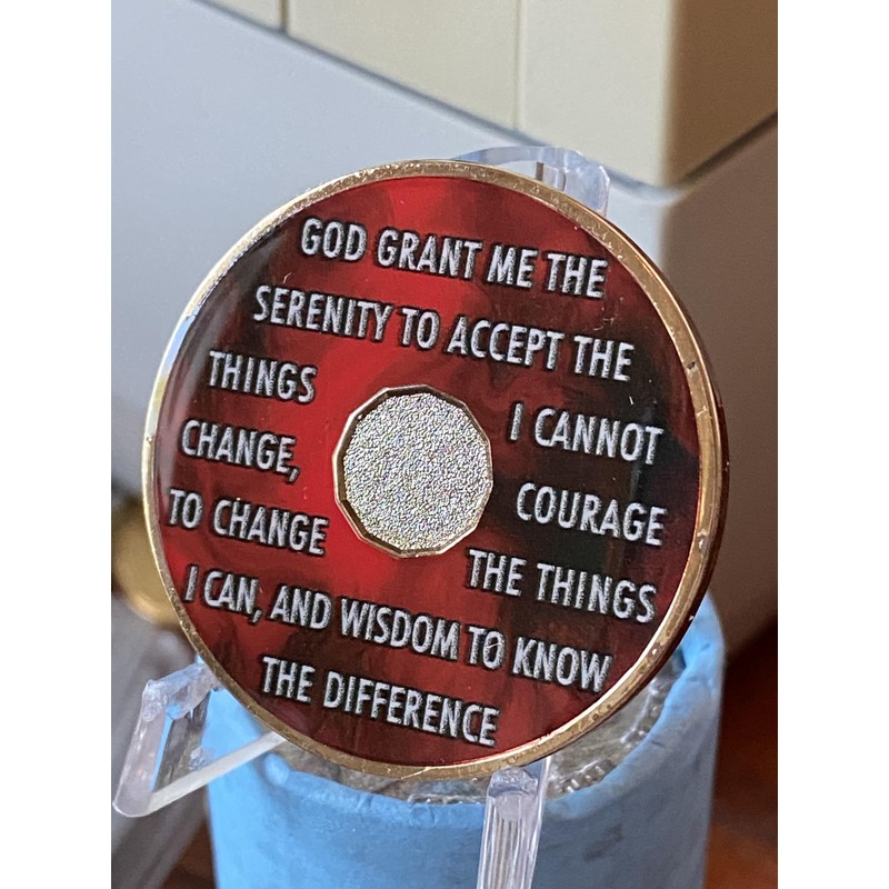 1 Year AA Medallion Lava Red Tri-Plate Sobriety Chip Serenity Prayer Back