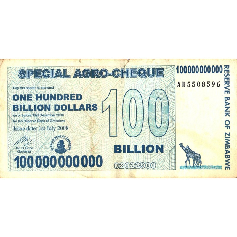 1 Zimbabwe 100 Billion AGRO CIRCULATED banknote 2008. Parker