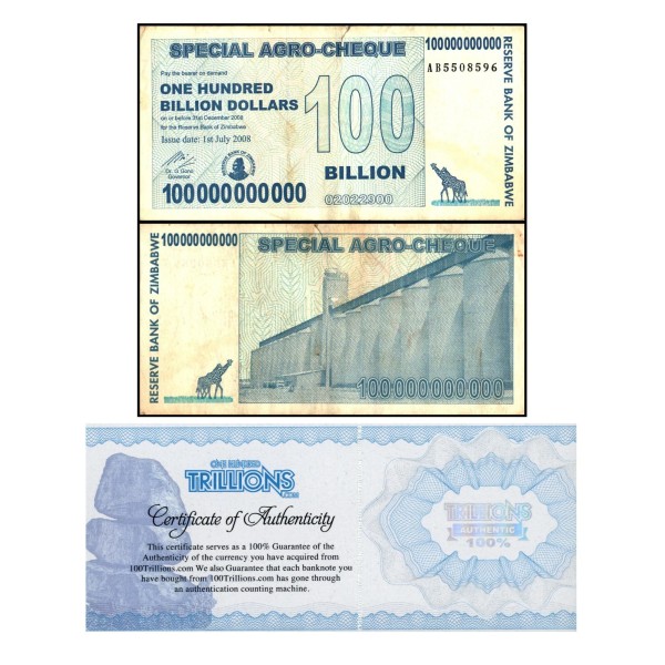 1 pcs x 100 Billion Zimbabwe AGRO Banknote (aka: "Zim Bond")