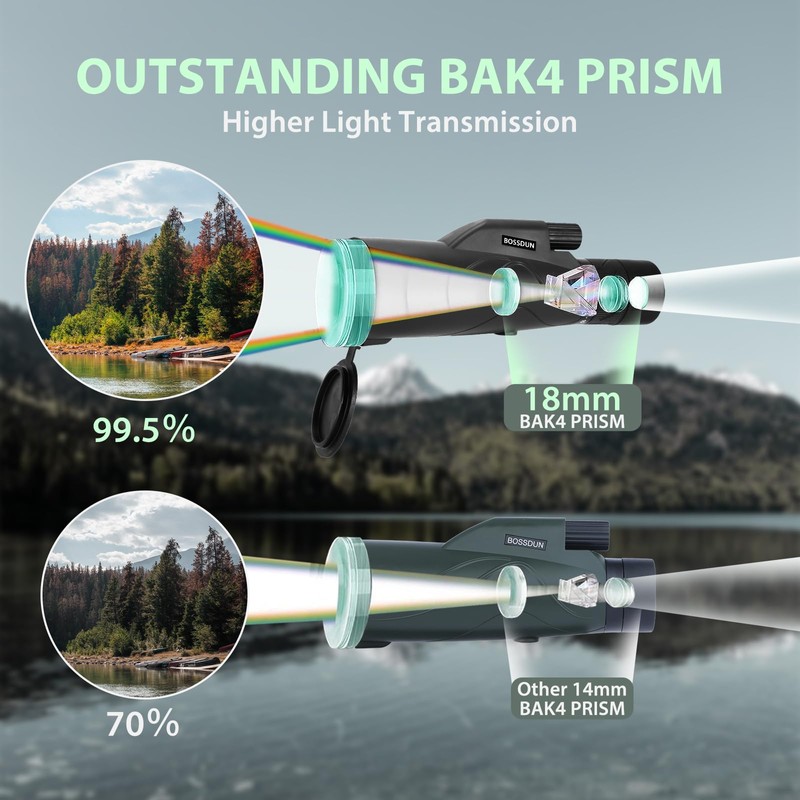 - High-quality optical FMC lens and BAK4 prism -- The fully multi-coated lens and large BAK4 prism increase light transmission and deliver bright, clear and high-contrast images even in low light conditions. Ideal for travel, bird watching, wildlife, camping, sports and concerts.