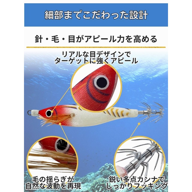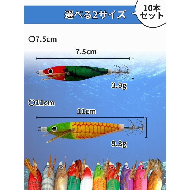 【商品仕様】〇セット内容:スッテ10本セット。〇バリエーション:7.5cm (全長:約7.5cm、重量:約3.9g)、11cm (全長:約11cm、重量:約9.3g)。〇対応仕掛け:イカメタル、オモリグ、ドロッパー、胴付き仕掛け。〇対象魚種:ケンサキイカ(マイカ)、アオリイカ、ヤリイカ、スルメイカ、スミイカ、コウイカ、タコほか多種。〇使用シチュエーション:船釣り、堤防・波止釣り、磯釣り、日中・夜間の釣行などに対応。※サイズにつきましてはあくまで目安のため若干の誤差が生じる場合がありますのでご了承下さい。※商品写真はできる限り実物と近づけるようにしていますが、お使いのモニター設定、お部屋の照明等により実際の商品と色味が異なる場合があります。※海外製品のため日本製のものと比べて細かいところで雑に見えるものや多少の誤差がある場合があります。恐れ入りますが予めご了承ください。※商品が入っているプラケースが痛んでいる場合がございますが、商品本体に問題はございません。予めご了承ください。