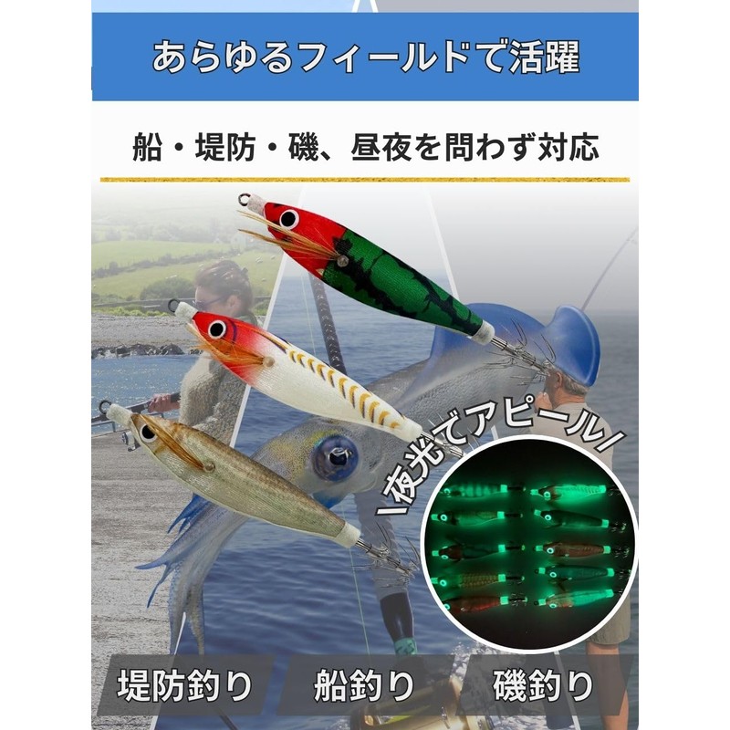 - 【豊富なカラーラインナップで多様な状況に対応】本セットには、赤緑、赤白といった定番の実績カラーに加え、黄色×緑のとうもろこしのような鮮やかなコントラスト、濃い目のピンクや紫など視認性の高い色合い、さらにグレー縞模様やこげ茶、明るめのブラウンといったナチュラル系カラーまで幅広く揃えています。濁り潮や夜間には赤やピンク系、日中やプレッシャーの高い状況ではブラウンやグレー系、光量の少ない深場では紫系カラーが活躍します。透明度や潮色、時間帯に応じて戦略的にカラーローテーションを行うことで、アオリイカ、ケンサキイカ(マイカ)、ヤリイカ、スルメイカなど多様なターゲットに対応可能です。釣行シーンごとの最適解を導き出すカラーバリエーションが、確かな釣果アップをサポートします。また、蓄光素材を使用した夜光(グロー)タイプは、光を吸収して暗闇で発光することで深場や夜間などの暗い環境でもイカに見つけられやすくなり、抱かせやすくなります。活性が低いときのリアクションバイトを狙う効果やスレたポイントでも目先を変えてアプローチできる利点もあります。