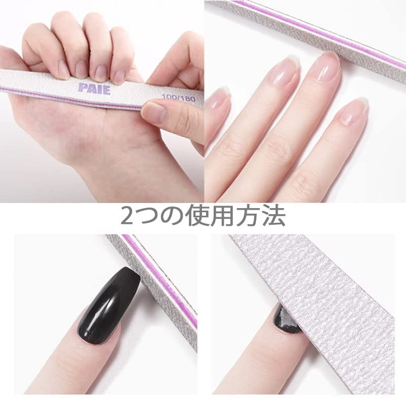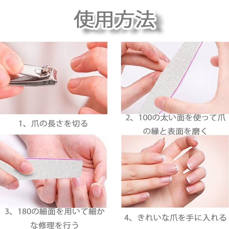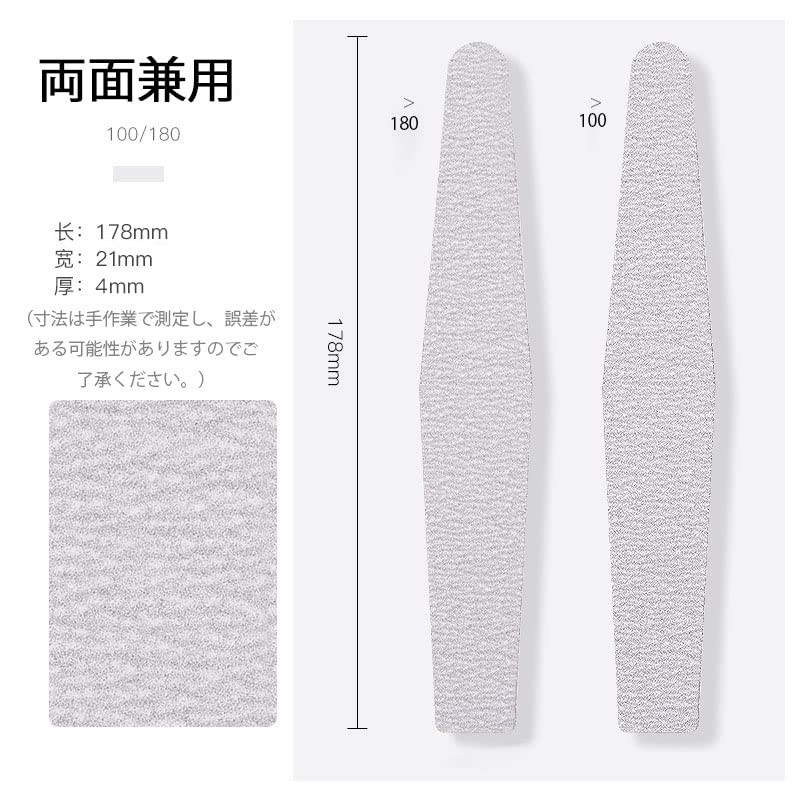- ♢爪を磨く:片面はメッシュ数100の粗砂面で、爪の磨きに適している。片面はメッシュ数180の細砂面で、爪のさらなる仕上げに適しています。両面を組み合わせて使用することで、爪を磨くだけでなく、爪を作るときに爪の余分なネイルジェルを除去することもできます。
