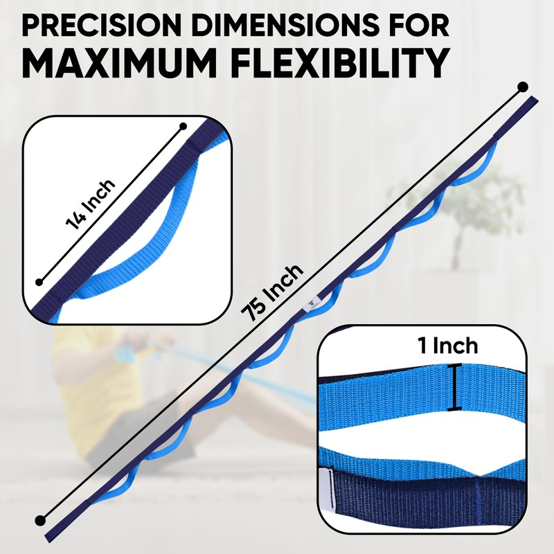 - Choose a strap that matches your height and flexibility. Therefore TOXFORD Straps with 10 built in loops (75 inches Length) accommodate different stretch levels and body sizes. Non-slip texture ensures secure grips and stable positioning.