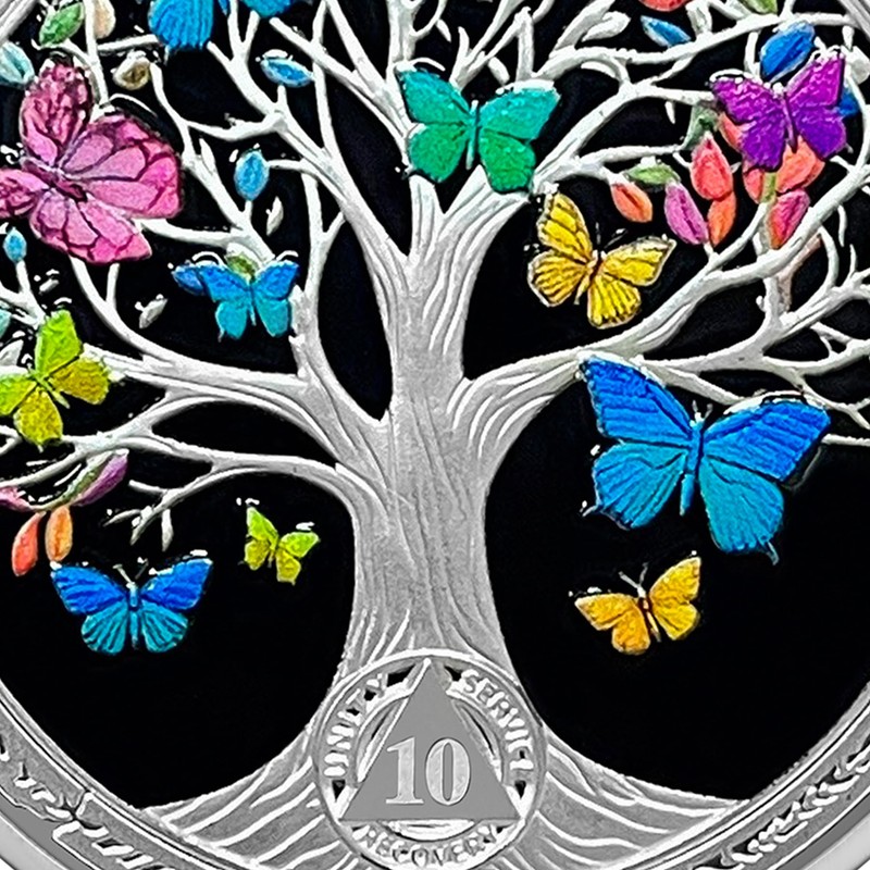 - Elegant Design Front Design: The coin's front features a Tree of Life with vibrant black butterflies, symbolizing transformation in recovery. The "10 Month" engraving marks your milestone in sobriety. Back Design: The reverse side displays the Serenity Prayer, surrounded by the Tree of Life’s branches, offering daily encouragement and wisdom.