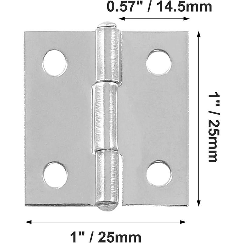 Package Content - Include 10 count stainless steel hinges and 42 count mounting screws. Enough to use or replace in your daily life. Size: 1 inch; Overall size: 25 x 27 mm/1inch x1.1 inch(L x W); Thickness: 0.6mm.