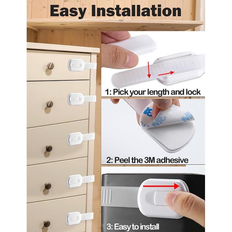 - EASY INSTALLATION: 10 child safety cupboard locks are equipped with 3M adhesive, no drilling required, no tools required. Tear off the sticker, stick it on and wait for 24 hours before use.