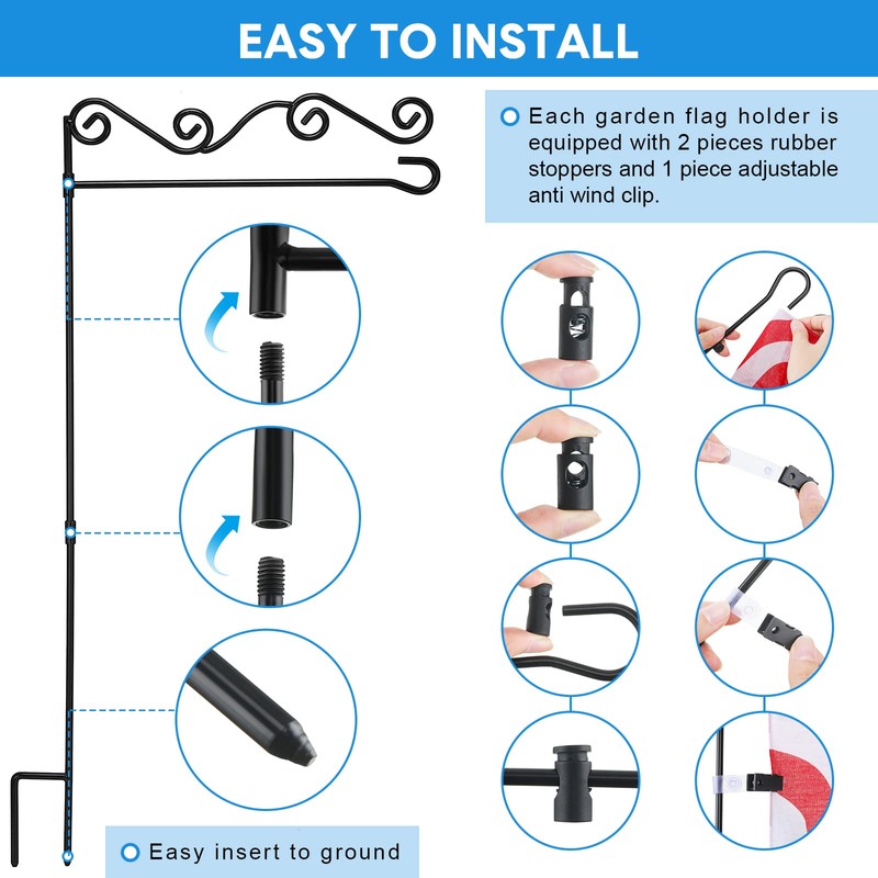 Each metal garden flag holder is equipped with 2 pieces rubber stoppers and 1 piece adjustable anti wind clip to assemble 3-piece folding rods, then insert it into the garden floor, which is simple and quick to install.