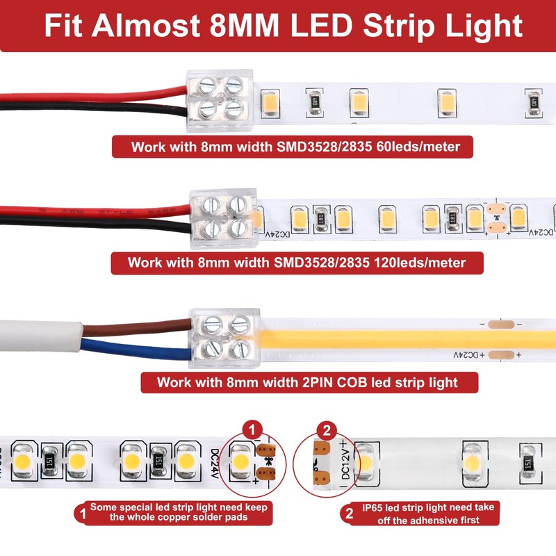 - Compatibility: LED connectors are compatible with almost 2 Pin 8mm 5V/12V/24V SMD 3528 2835 2216 LED tape lights and COB Led strip light (Notice: NOT suit for RGB led strip)