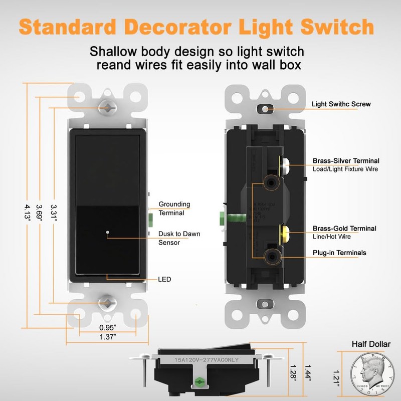 - STANDARD SWITCH: Single pole electrical wall light switch, rating 15Amp 120/277Volt. Back insert and side terminal wiring, grounding screw. Compatible with LED,Incandescent,CFL, Halogen and Fluorescent lighting. Use with standard wall plate(sold separately)