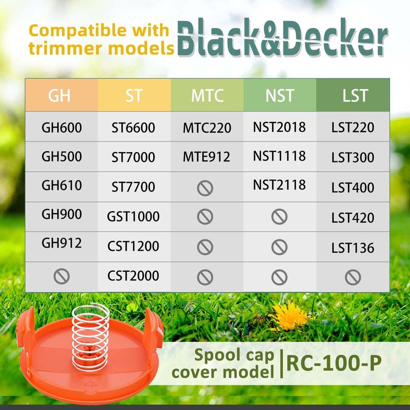 Replacement spool is compatible with most for BLACK+DECKER string trimmers including:GH400, GH500, GH600, GH610, GH900, GH912, ST6600, ST7000, ST7700, CST1000, CST1200, CST2000, MTC220, MTE912, NST2018, NST1118, NST2118, LST220, LST300, LST400, LST420, LST136