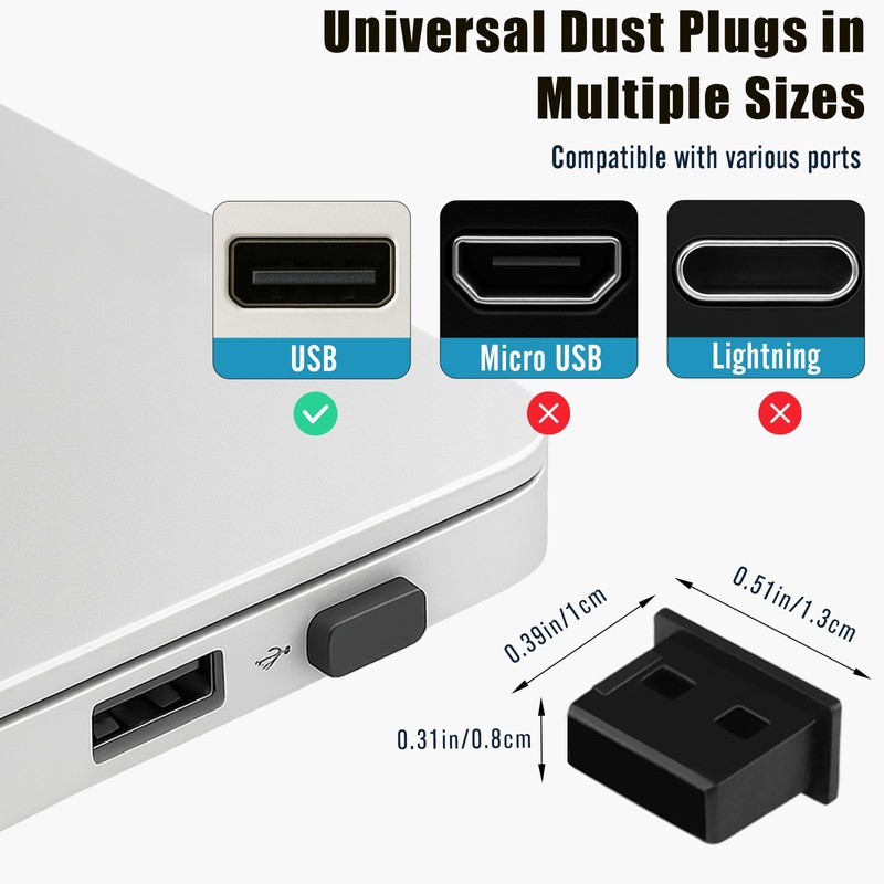 - Keep Your USB Ports Clean and Protected Say goodbye to dusty, gunky, or lint-filled USB ports. These USB-A dust plugs act like tiny shields that block out debris, sand, and moisture—keeping your connections clean and your devices charging smoothly every time.