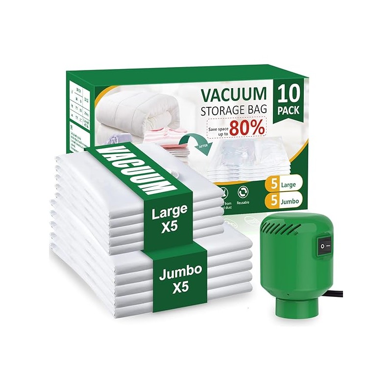 10 Pack Vacuum Storage Bags (5 Jumbo/5 Large) with Electric Pump, Reusable Compression Space Saver Bags for Autumn And Winter clothing, Mattress, Bedding, Quilts and Pillows, Comforters, Travel, White