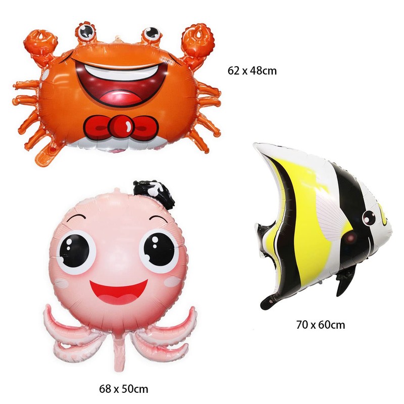 Package: 10 Pcs Foil Ocean Animal Balloons, Different styles, Dolphin, Crab, Shark, Octopus, Starfish, Tropical Fish, Seahorse and so on.