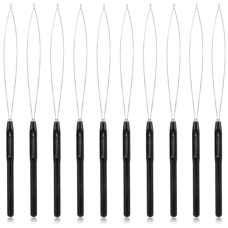 10 Pieces Hair Extension Loop Needle Threader Pulling Hook Tool, Bead Device Tool for Hair Extensions or Feather Extensions,Micro Loop Nano Beads Device(Black)