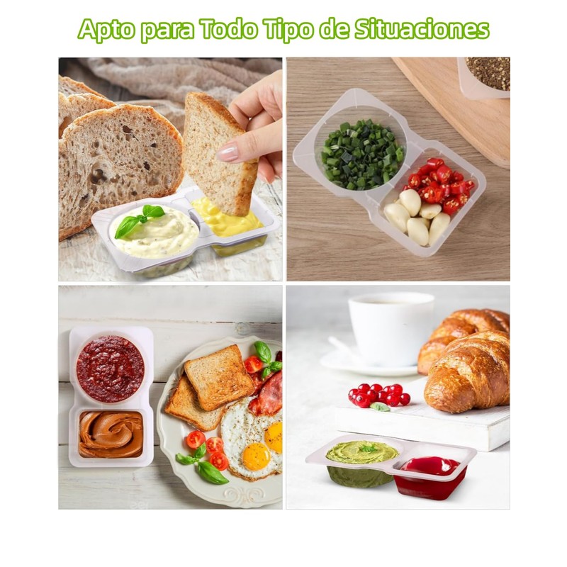 - 【Diseño de 2 compartimentos】Los recipientes reutilizables para aperitivos con tapas de 2 compartimentos se pueden usar tanto para condimentos como para aperitivos. Este diseño permite almacenar y transportar fácilmente diferentes alimentos, evitando que se mezclen los sabores y manteniendo la frescura.