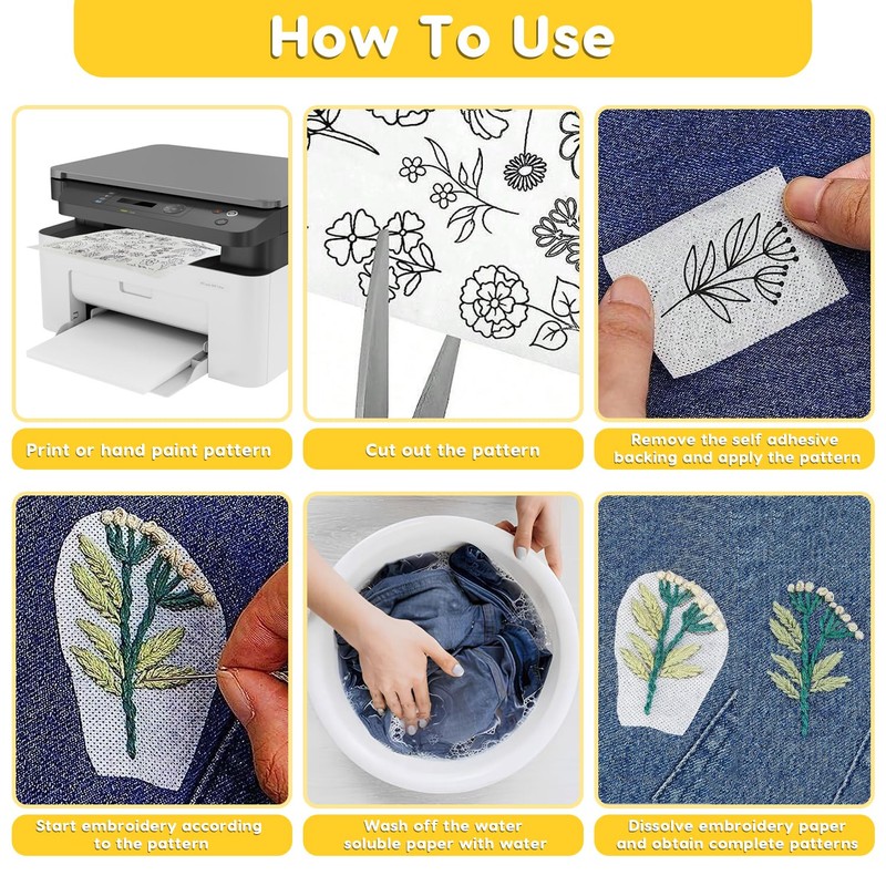 - EASY TO USE: The back of our embroidery stickers is self adhesive and can be easily attached to the fabric. Peel off the release paper, stick the pattern in place, and then rinse it clean after completing the hand or machine embroidery without leaving any traces