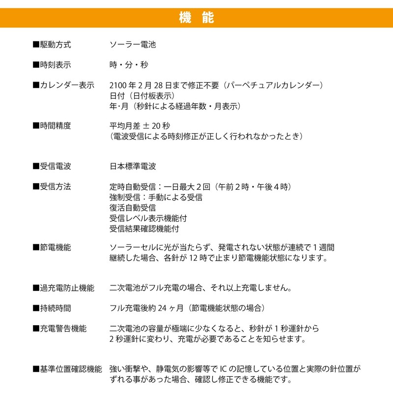 - Features: Radio reception function (Japan standard radio waves / Fukushima station / Kyushu state), dials with luminescence (11 hour markers, 12 separate rings), luminous hands, energy saving function, overcharge prevention function, charging warning function, standard position checking function, last time when fully charged (24 months)