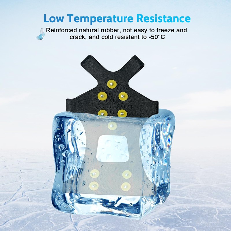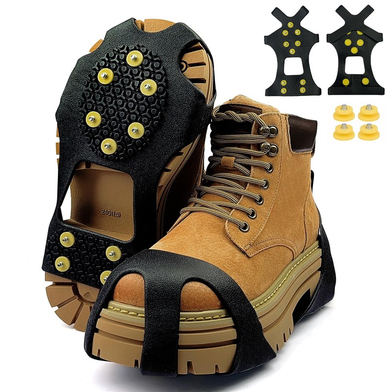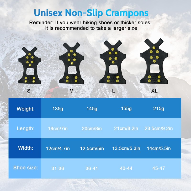 - Our non-slip ice hoops are equipped with 10 spikes and available in different sizes: S, M and L to meet different needs. With them, walking on challenging terrain such as ice and snow becomes much easier.