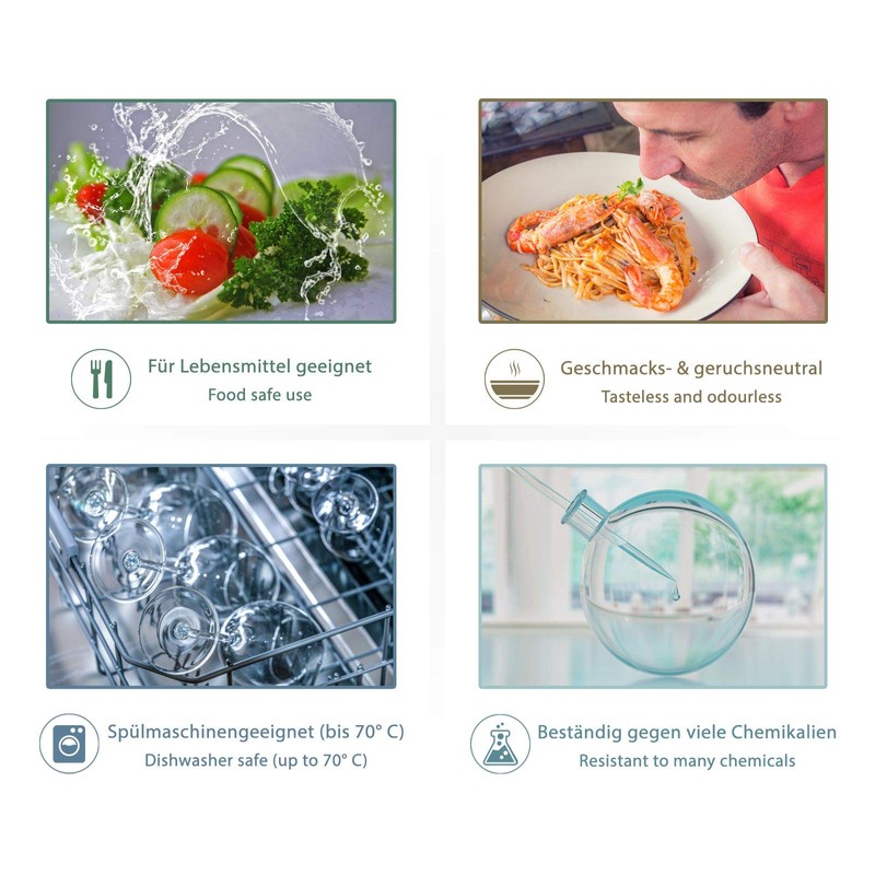 - Food-safe, dishwasher-safe (up to 70°C), odourless and chemical resistant