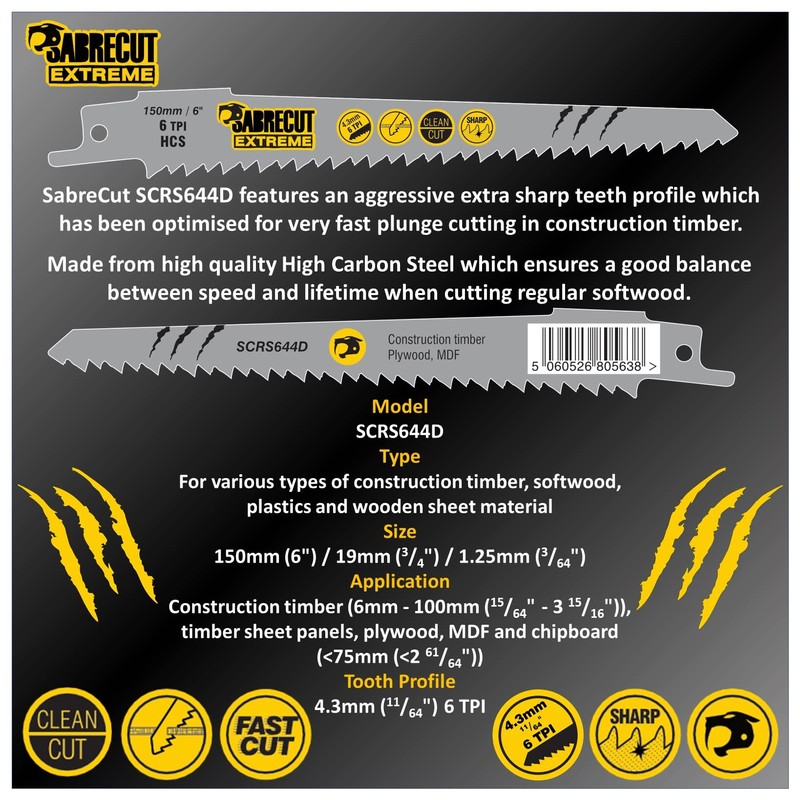 Sabrecut SCRS644D features an aggressive extra sharp teeth profile and has been optimised for fast straight and plunge cutting in construction timber (6-100mm), boards: chipboard, MDF (6-60mm), plywood, plastic (less than 100mm).