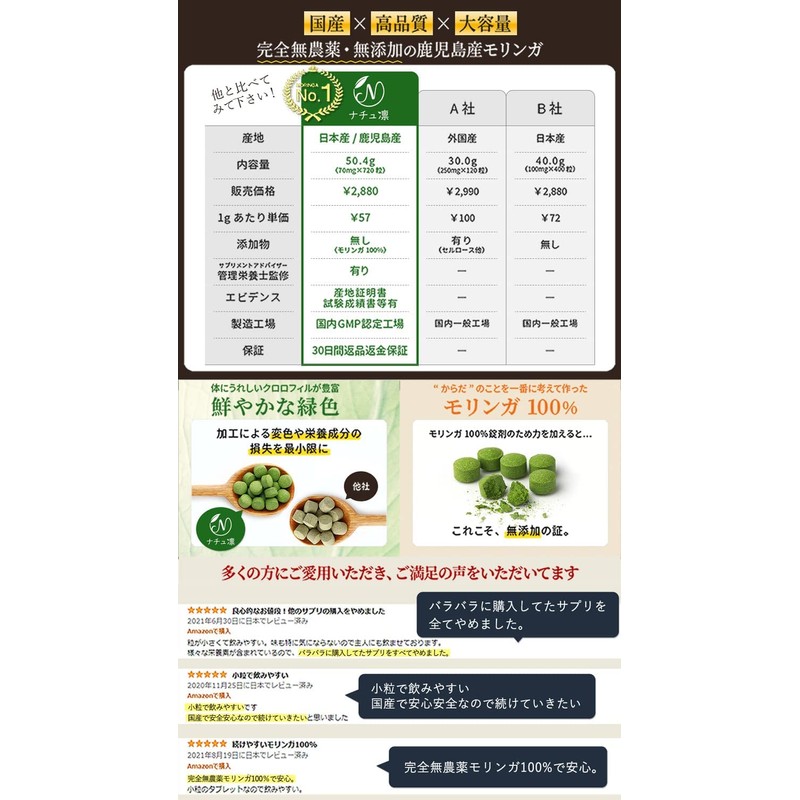 - ✅【 プチギフトにオススメです 】健康や美容を気遣う女性や家族へのプチギフトにオススメです。商品はナチュラル感ある未晒クラフト紙を使用した、ナチュ凛オリジナルパッケージにてお届けします。 ✅【 購入後30日間の安心保証 】どんな理由でもご満足いただけなければ、初回購入分の代金はご返金いたします。お気軽にお試しくださいませ。 ◆原材料:鹿児島産モリンガ末◆内容量・お召し上がり方:70mg×720粒(50.4g)、1日12~20粒を目安に水などと共にお召し上がりください。◆保存方法:直射日光・高温多湿を避けて涼しいところで保存してください。* ・