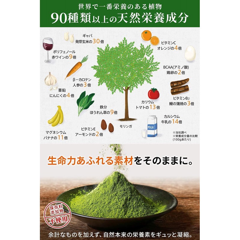 - ✅【 世界で一番栄養のある植物 】モリンガにはβ-カロテンやビタミンB群、ビタミンC、ビタミンEなどの『ビタミン』、カルシウムやカリウム、鉄分などの『ミネラル』、BCAA、ギャバなどの『アミノ酸』、ポリフェノール、クロロフィルなどの『ファイトケミカル』などといった“身体をサポートする90種類以上の天然栄養成分”がバランスよく含まれています。* ・