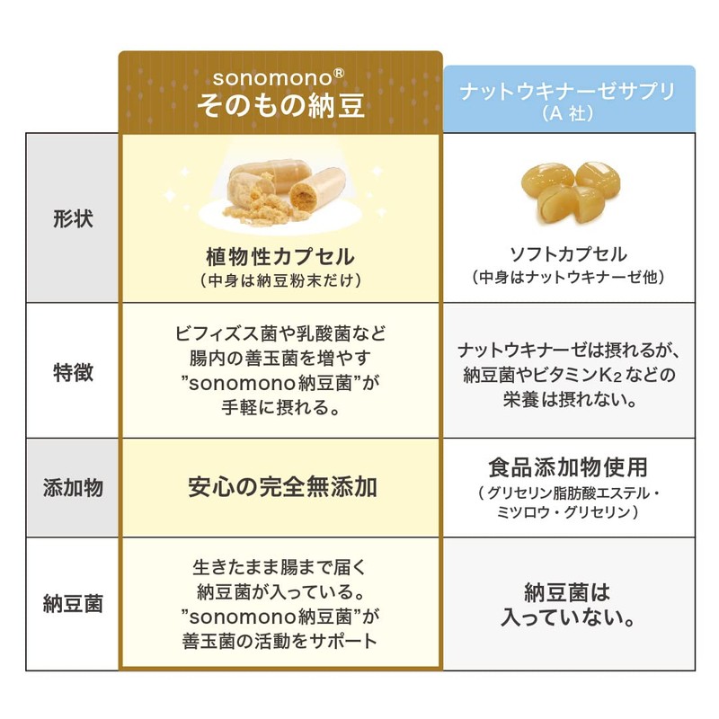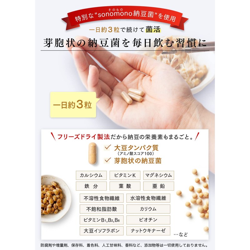 - 【国産・完全無添加】化学農薬・化学肥料不使用で栽培された、佐賀県江北町有機研究会の大豆と"sonomono納豆菌"でつくった納豆を100%使用した完全無添加のサプリメント。※災害などの影響により大豆の産地は変わることがあります。