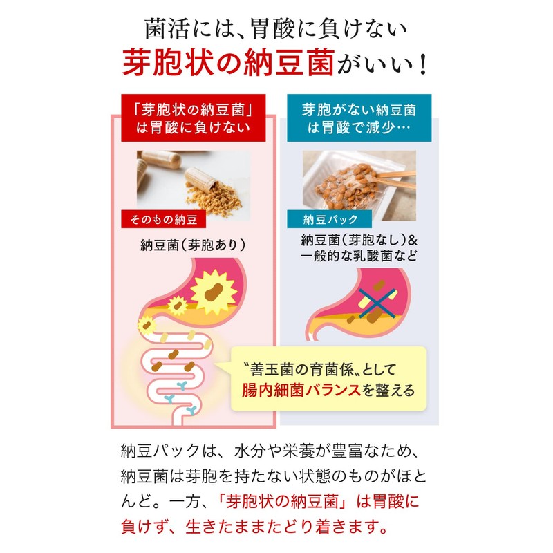 - 【生きて届く納豆菌】 どんな過酷な環境下にも耐える強い納豆菌は、胃酸に負けず生きたまま届きます。納豆菌は自ら善玉菌として働きながら、乳酸菌のエサとなるオリゴ糖をつくったり、乳酸菌が苦手な過酸化水素を分解するなどして、乳酸菌が元気に働けるようにサポートします。