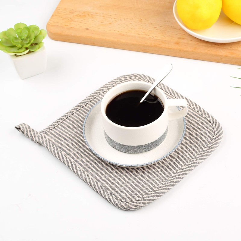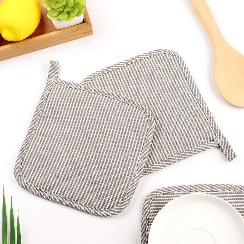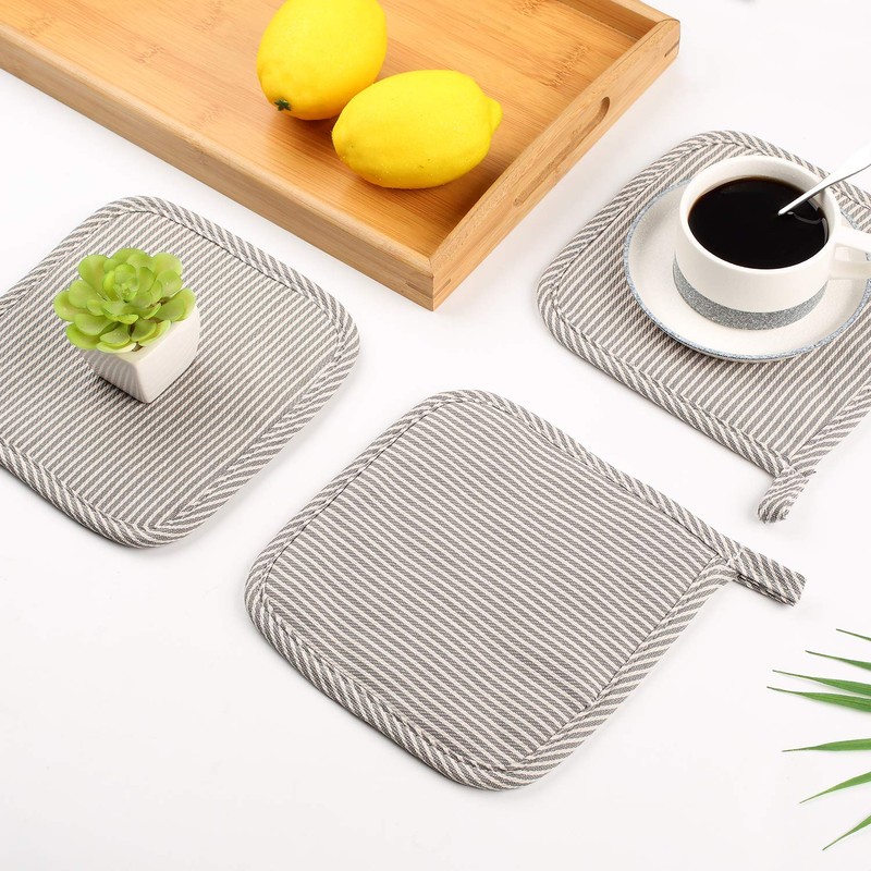 100% algodón cocina uso diario Basic Terry Pot Holder resistente al calor Posavasos Potholder para cocinar y hornear 7 x 7 pulgadas Set de 3 rayas grises