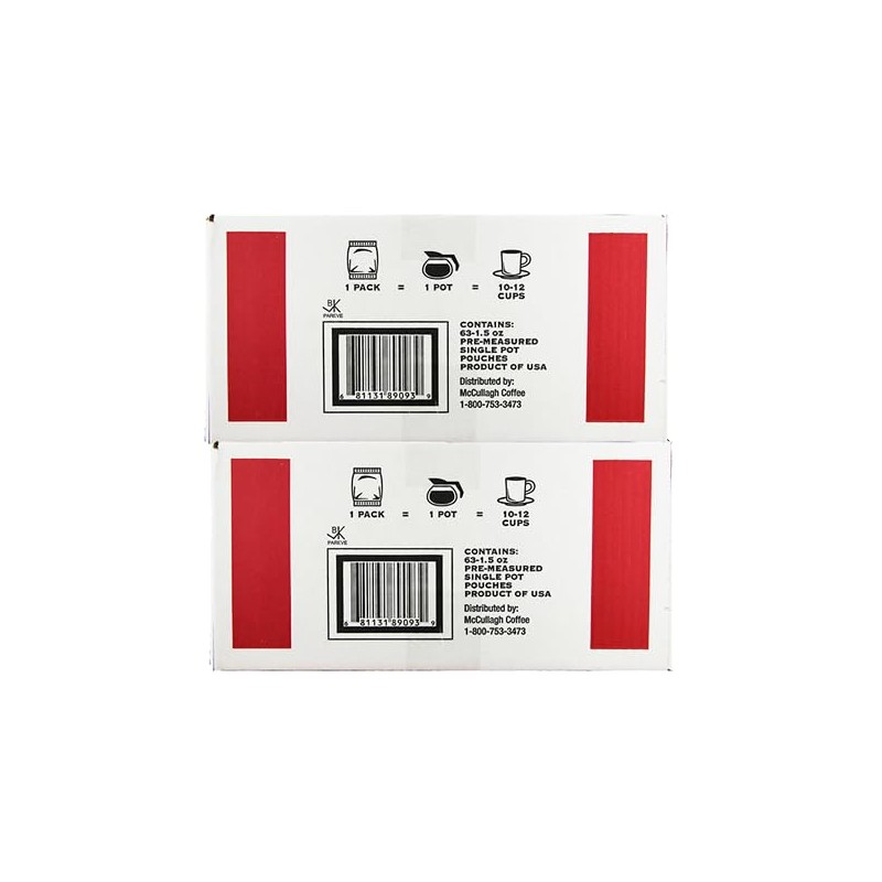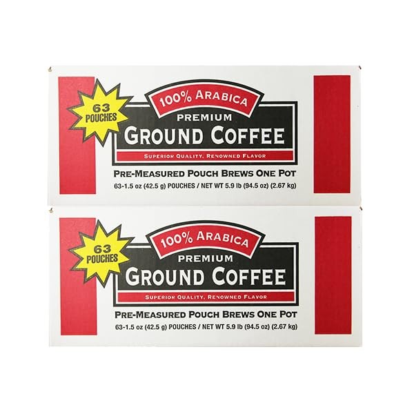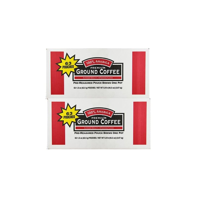 Our 100% Arabica Premium Ground Coffee is sure to delight. This is a mild, medium roast blend of Brazilian coffees, in convenient pre-measured pouches that are perfect for restaurants and offices. This product includes two 63 count cases, for a total of 126 packets of coffee. Each package contains 1.5oz of coffee, and is perfect for use in home and commercial (10-12 cup) brewers.