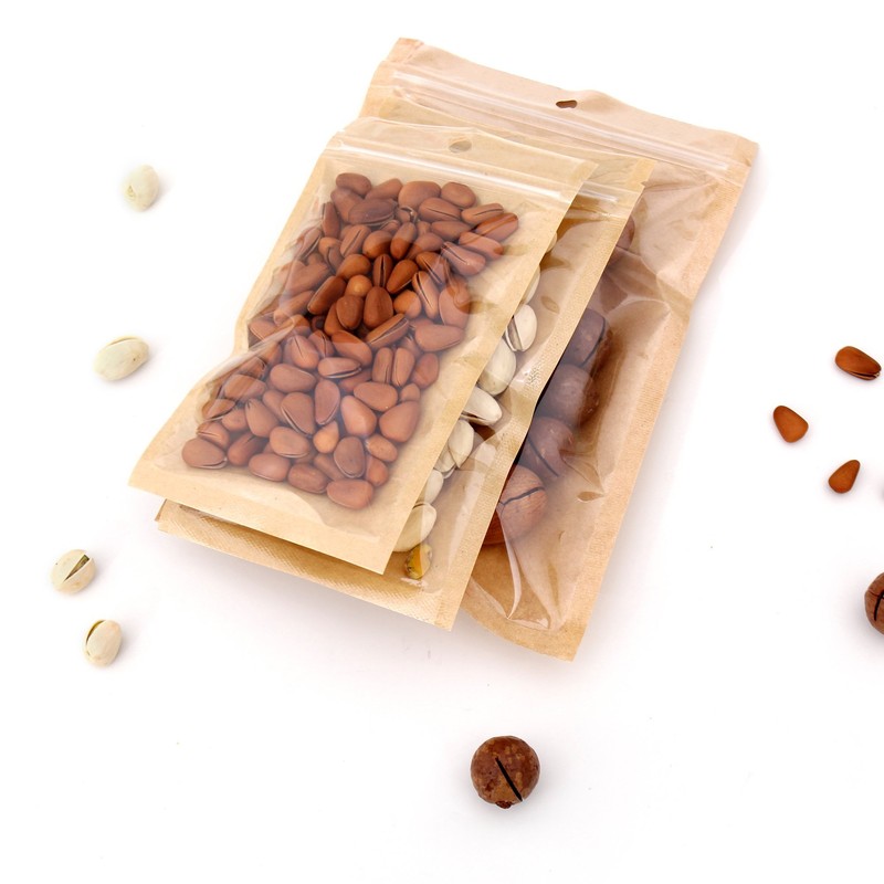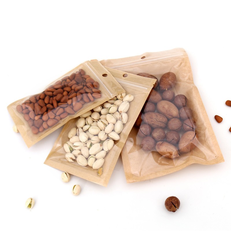 100 Bags/Pack Clear Front Kraft Paper Back with Round Hang-hole Food Safe Resealable Packagaing Bags (6.3" x 9.4", Clear/Kraft)