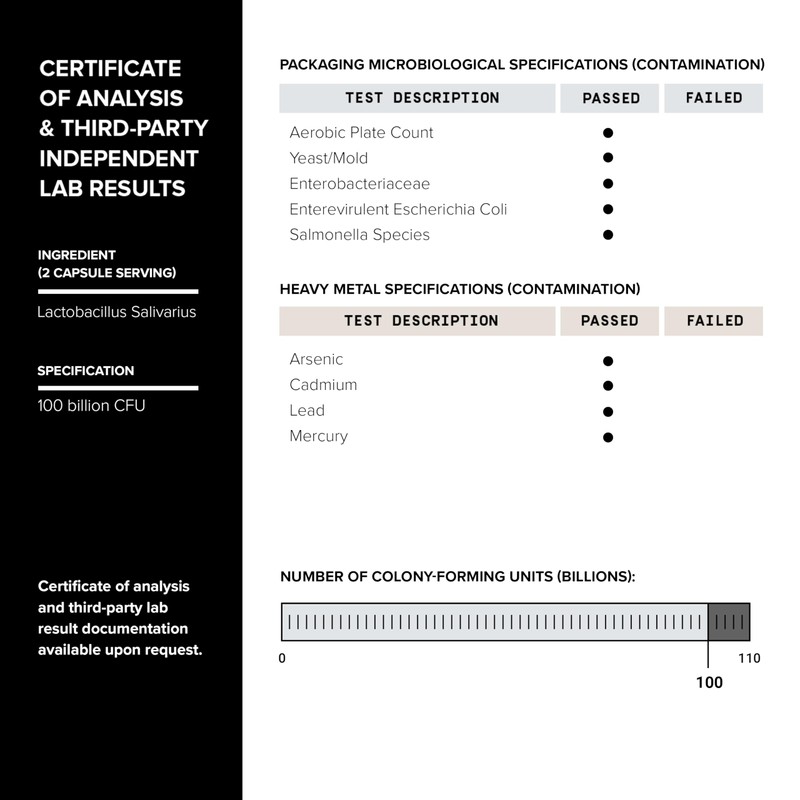 - Third-Party Tested Lactobacillus Salivarius: Lactobacillus Salivarius Probiotic is currently one of the most well-researched probiotic genera, lauded for its ability to support oral and dental health.