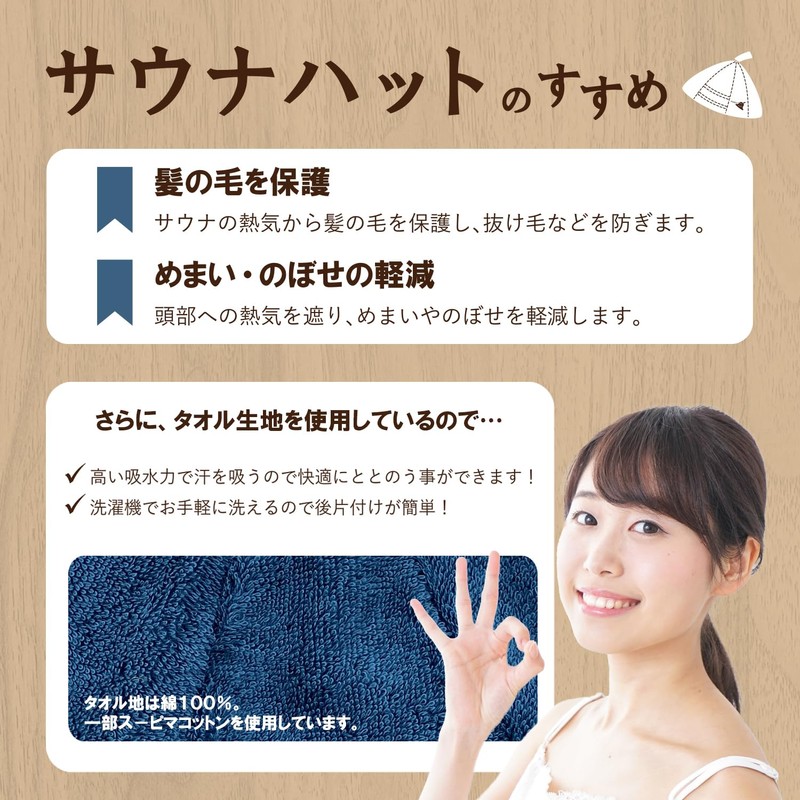 - (Make your life healthier) The sauna hat is popular in Finland as well as saunas. This sauna must-have item is made with 100% cotton towel fabric. ● Protects hair from heat and humidity of sauna, preventing hair loss and other damage. Blocks heat from the head and reduces dizziness