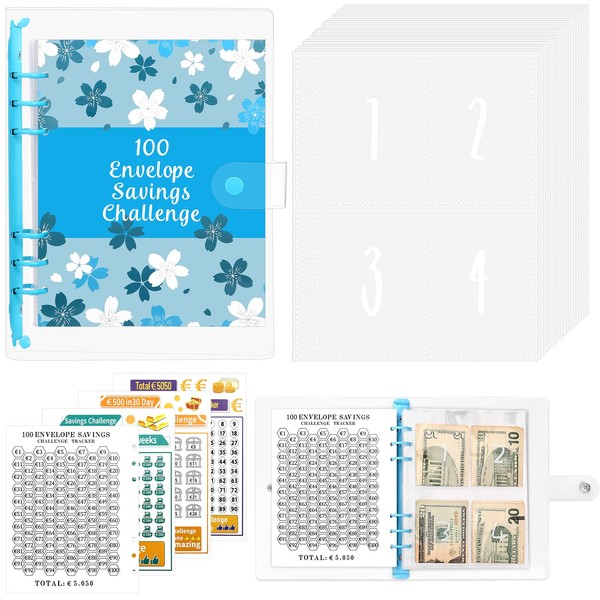 - What you get: 1 x A5 blue PVC folder, 25 inner pages with numbered 1-100 (4 money pockets per page), 4 x challenge tracker cards, perfect for personal and family budgets to help you save for different destinations such as car, travel, emergencies and more!