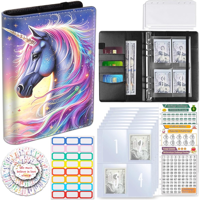 - You Will Receive: 1pc A5 leather binder, 3 different style challenge trackers and 25pcs 6-hole cash envelopes pre-printed with 1-100, Money Saving Binder will help you build an emergency savings fund and manage your finances effectively. 2 PVC coin zipper pouches, 1 colorful sticky note, 20 inspirational quote stickers! Also it's a great tool for teaching children the habit of saving.
