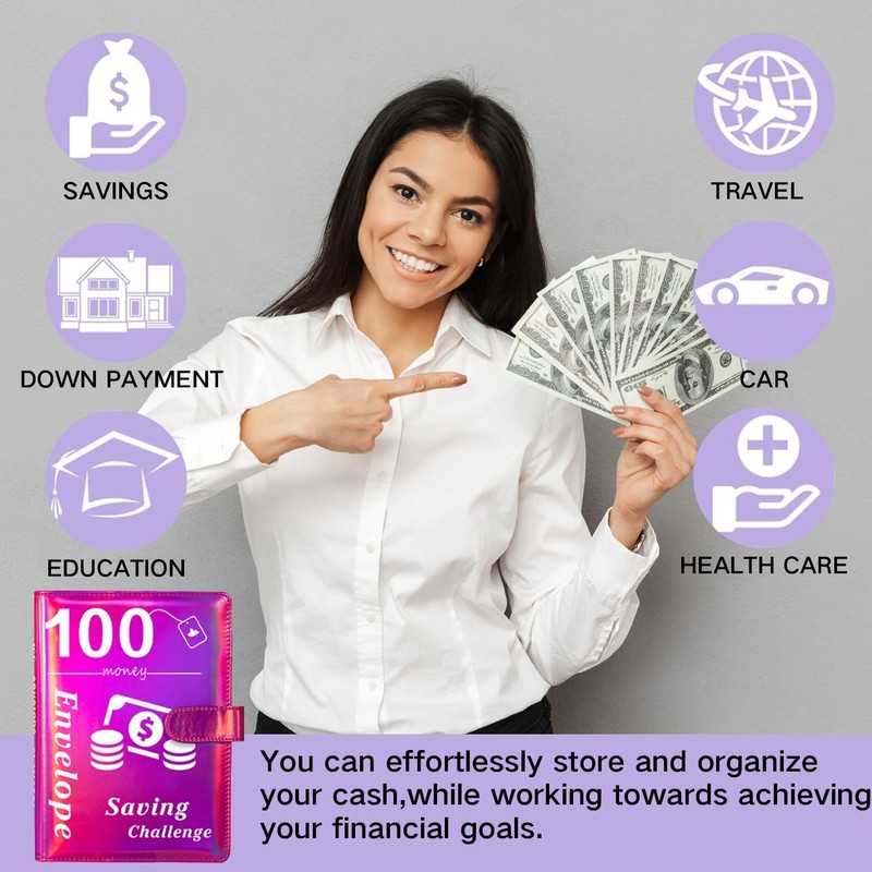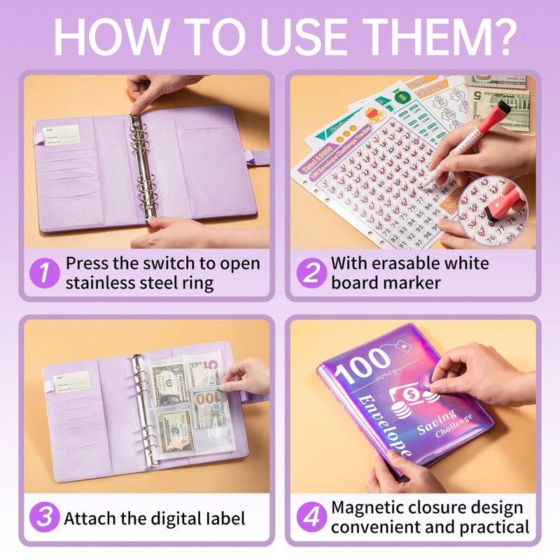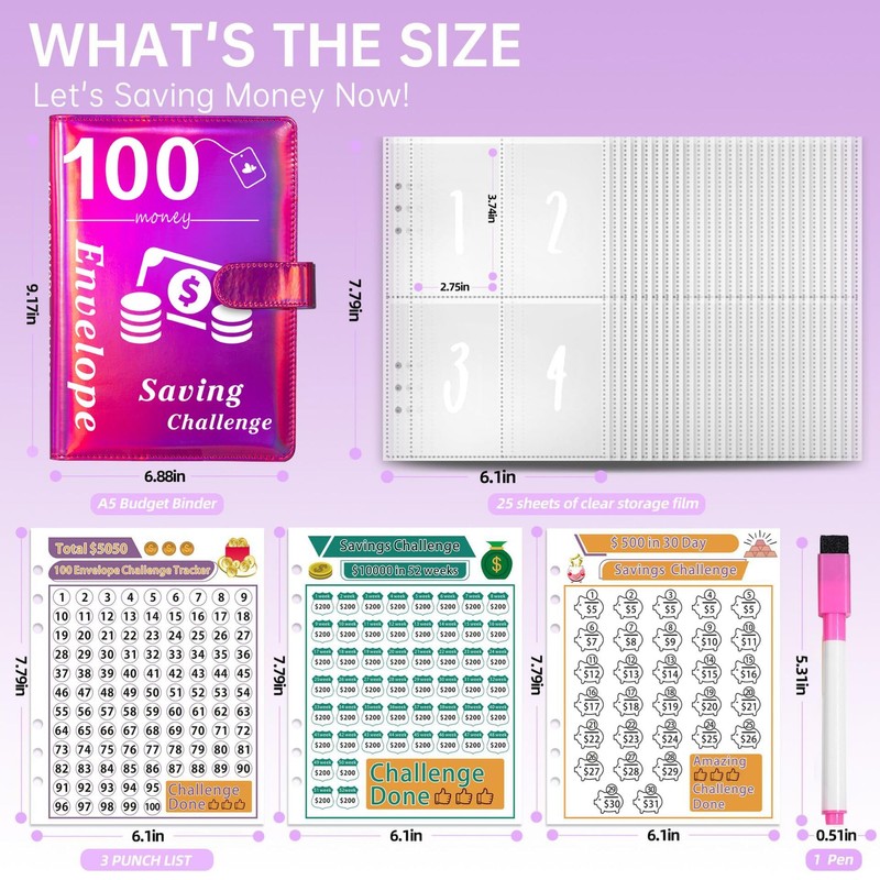 - 💰【What You Got】: Our saving challenge binder kit includes: a erasable mark pen, saving $5,050.00 in 100 days tracker, saving $10,000 in 52 weeks tracker, saving $100.00 in 30 days tracker, 100 number printed envelops, a starting date and finishing date recording card, 1pc PU leather A5 size binder.