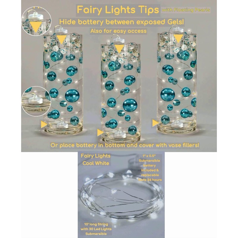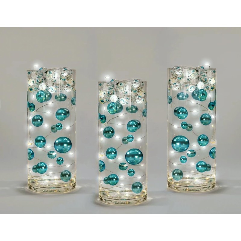 - Fills 2 gallons of 100 Floating Pearls, Gems, and the Transparent Water Gels for your vases. No hole Turquoise Blue Pearls in: 6 jumbo (30 mm/1.25"), 12 large (20 mm/0.75"), and 32 medium (14 mm/0.5") + 50 Matching Gems (0.75"). Plus our exclusive Gels Floating Kits include 2 Packets of the most unmatched Transparent Water Gels with 2 Measured Prep/Storage Bags. So no guessing and best results! Also includes the above set plus 6 Fairy Lights strings in White for enhancing the Pearls. See Fairy Lights image for details