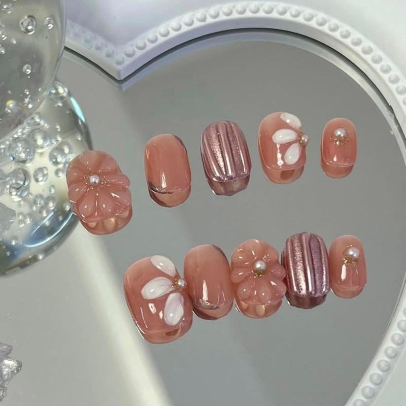 100% Hand-painted Cute Coral Flower Y2K Korean Japanese Douyin Inspired 3D Short Gemstones Durable Reusable Gel Acrylic Press-on Nails 10 pc set (XS)