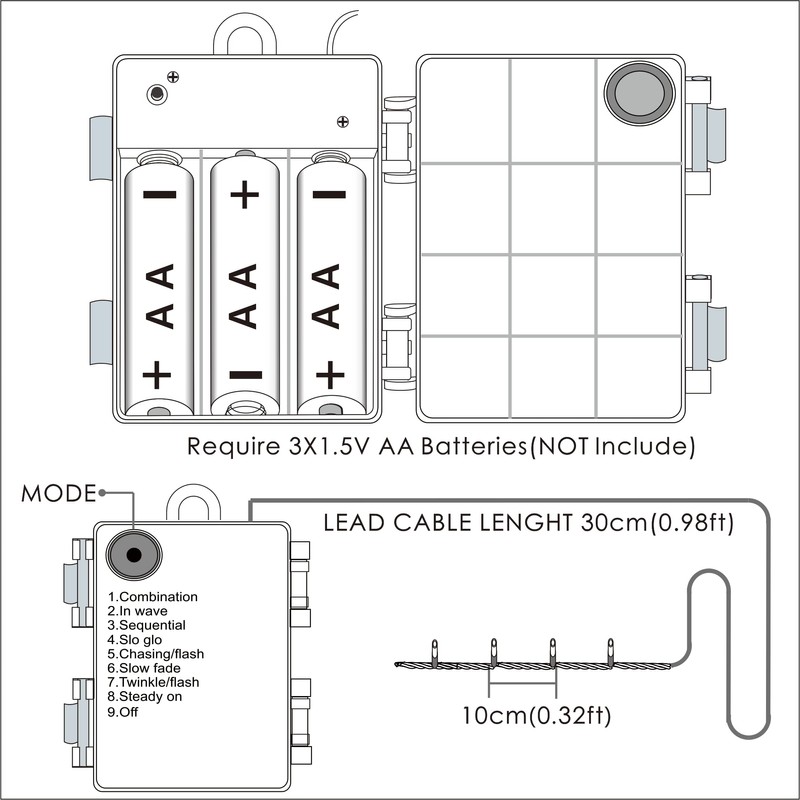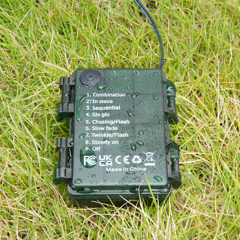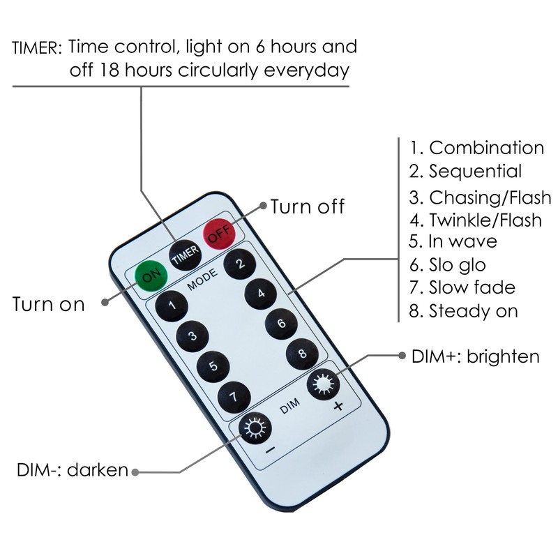 8 Light Effects (activated by remote controller) : 1. Combination; 2. In Waves; 3. Sequential; 4. Slo Glo 5; Chasing/Flash; 6. Slow fade; 7. Twinkle/flash; 8. Steady on; 9. Off