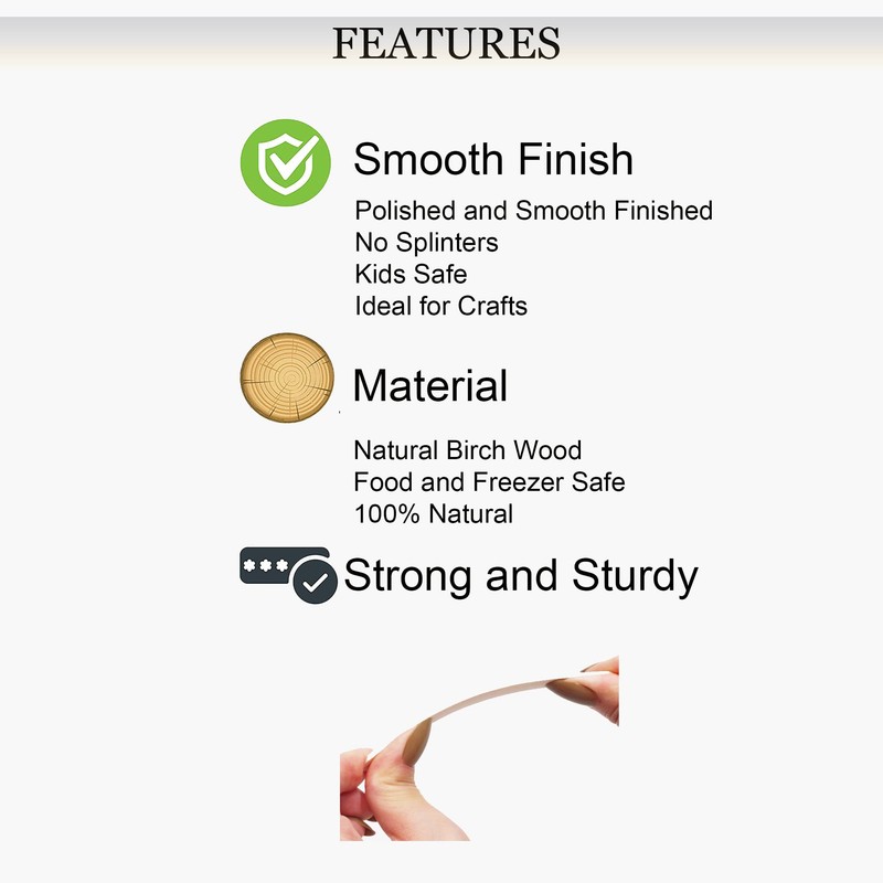 Material : Natural Birch Wood | Size : 114 X 10 X 2 mm | Features : Extra Durability & Strength Polished smooth round edges No Splinters Safe for Kids Multiple uses.
