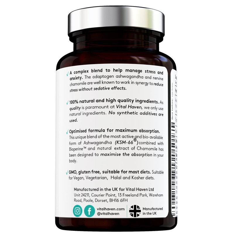 - ✔ VITAL HAVEN'S OPTIMISED FORMULA: the complex blend of the most bio-available form of Ashwagandha and Chamomile Flowers, combined with Bioperine to maximise absorption, allows you to fully benefit from the power of each ingredient. This unique formulation of the most active and advanced form of Ashwagandha (KSM66) associated with the well-renowned relaxing effects of Chamomile has been designed to relieve you from stress and anxiety.