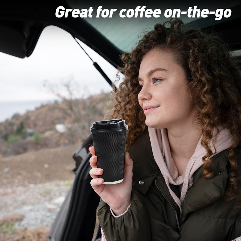 - 【INSULATED CORRUGATED】: Three-layer corrugated outer cover have good insulation and is easy to grip. This rigid outside helps keep them from burning your hand and can be prolonged use. The tight-fit lids can prevent water leakage and portable. Insulated paper cups are perfect for hot or cold drinks such as coffee, hot cocoa, juice, milk, etc.